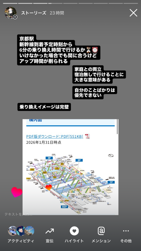 新幹線に乗っている間に、京都駅での乗り換えをイメージトレーニングした。新幹線到着から6分で在来線に乗り換えが必要。京都駅はほとんど使ったことがなく、広さのイメージがないので全く想像がつかない。