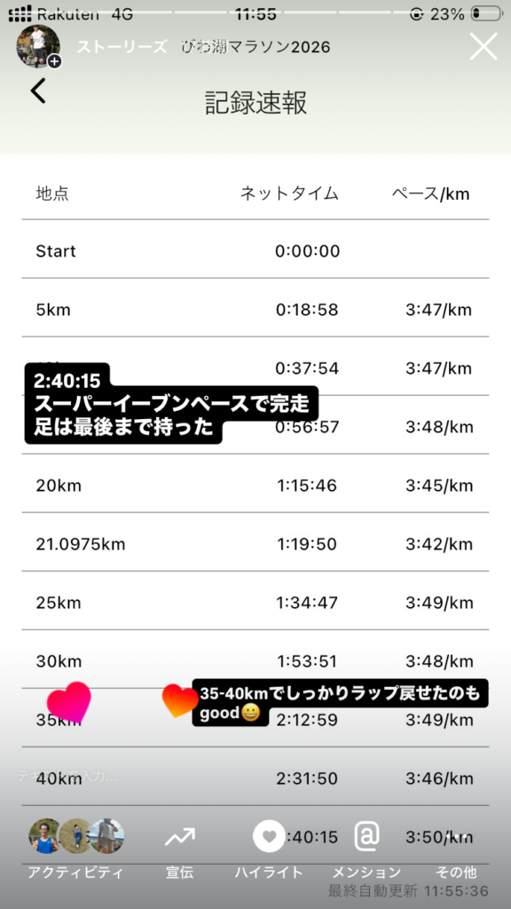 ペース配分も適切だったと感じています。最後までペースを落とすことなく走れたこと、35-40kmでほぼ最速に近いラップを出せたことに満足しています。